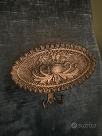 Vendo particolare pannello decorativo/appendiabiti in stile classico. Struttura in legno tornito laccato nero con dettagli in ottone e pannelli rivestiti in velluto verde petrolio. Dotato di 3 ganci appendiabiti in metallo dorato. Ideale per ingresso o come testiera decorativa. Pezzo di carattere.