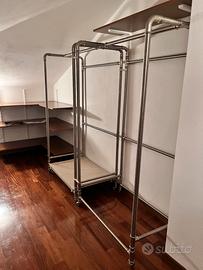 Appendiabiti in tubolari di acciaio con ruote, ideali per posizionamento in cabina armadio. 1 componente orizzontale di dimensioni 200 x 100 x 50 e 2 componenti verticali di dimensioni 84 x 152 x 55.