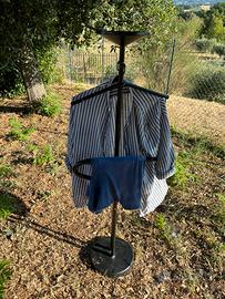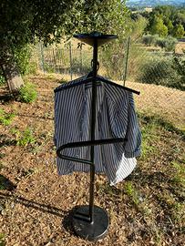Elegante e robusto appendiabiti in ferro nero opaco. Ha due grucce sempre in ferro ma possibile aggiungerne ancora di proprie, un tubolare porta pantaloni ed in cima un contenitore porta oggetti diam. 25cm.