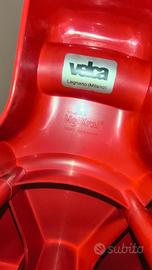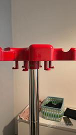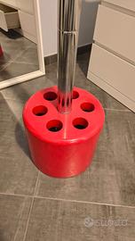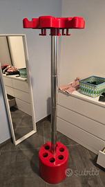 L'oggetto mostrato nell'immagine è un appendiabiti da terra, nello specifico il modello "Vip" disegnato da Roberto Lucci e Paolo Orlandini per Velca Legnano (Milano) negli anni '70. Caratteristiche principali: È realizzato in plastica (spesso antistatica e di colore rosso vivace, come nell'immagine) e metallo cromato. Lo stelo centrale è componibile e modulabile in altezza. La base inferiore funge da portaombrelli (con alloggiamenti per sei ombrelli). La parte superiore presenta ganci per appendere vestiti e una piastra girevole. È un pezzo di design iconico e ricercato, non più in produzione.