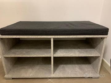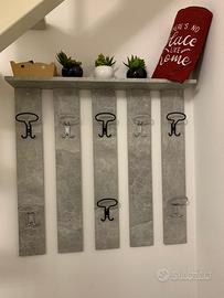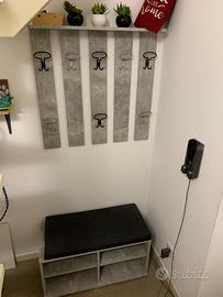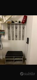 Vendo appendiabiti con in basso la scarpiera in legno color grigio chiaro. Sopra all’appendiabiti c’è una mensola porta oggetti.