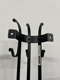 "Appendiabiti verticale da muro. Appendiabiti dal design verticale con ganci curvi (6 ganci in totale). Si tratta di un appendiabiti da parete in acciaio con rivestimento a polvere nero. Presenta tre ganci doppi (per un totale di 6 punti di appoggio) disposti verticalmente su una struttura a tre binari.