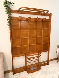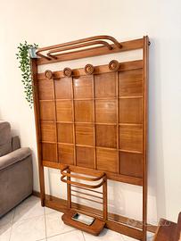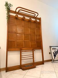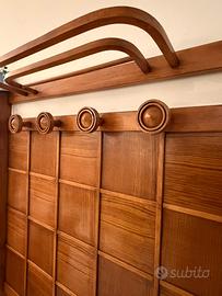 Splendido ed elegante appendiabiti da terra in stile Art Déco, risalente alla metà del XX secolo (anni ‘30-‘40). Un pezzo di design autentico, ideale per dare un tocco di classe e calore a ingressi, corridoi o uffici di rappresentanza. Legno massello di alta qualità con una calda tonalità naturale e venature a vista. Struttura geometrica con una raffinata pannellatura centrale a scacchi lavorata a rilievo. Ampia cappelliera superiore con doppia barra ricurva. 4 ganci a pomello robusti per cappotti e giacche. Portaombrelli integrato nella parte inferiore, completo di barre di contenimento. Vaschetta raccogligocce originale in metallo estraibile alla base. 📐122x28 h172 💶190€ 📦Possibile spedizione 📍Ritiro Lugo (Ra)