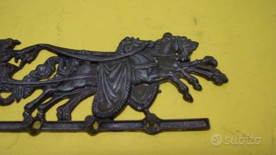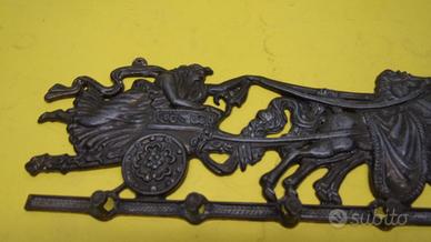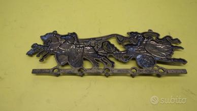 Appendichiavi da muro in metallo, 5 ganci, larghezza 28 cm - tema: ninfa su biga trainata da 2 cavalli - ottimo stato - [qw 9255] -