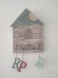 Appendichiavi artigianale in legno inciso al laser, a forma di casetta con un suggestivo paesaggio notturno e luna.
