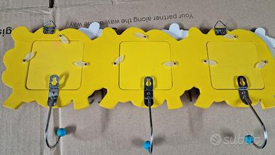 Appendino bambini per stanzetta con 3 ganci e 3 portafoto (6.5x6.5cm) dimensioni 42x14cm in legno colore giallo nuovo mai utilizzato