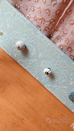 appendino in legno colore azzurro/bianco. 4 pomelli appenditutto. Le misure sono 80x20 cm nuovo completo di ganci per appenderlo.