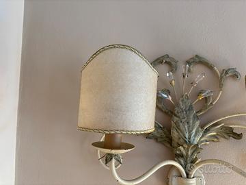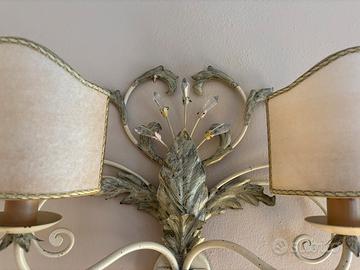 Applique da parete in ferro battuto, artigianato fiorentino dipinta a mano, nei colori verde e avorio anticato con paralumi a ventola e cristalli Swarovski.