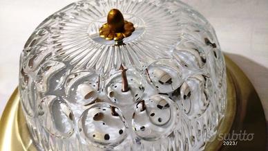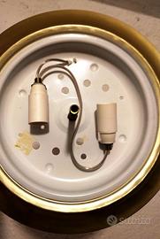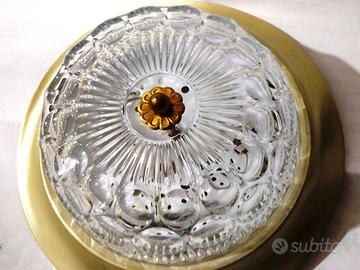 Deliziosa applique "a torta" anni'70, con cornice e supporto metallico di colore dorato esternamente, installabile sia a parete che a soffitto, rimessa a nuovo e a norma di sicurezza elettrica (messa a terra), completa di tasselli di fissaggio (lampadine E14 non incluse). Diametro esterno 32,5 cm; profondità 13,5 cm; diametro interno vetro 23,5 cm; spessore cristallo 0,8 cm. peso approssimativo 1.5 Kg Attenzione: fare installare esclusivamente da personale qualificato.