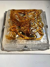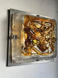 Progettata dal designer e maestro vetraio Carlo Nason per la vetreria Mazzega di Murano a metà degli anni 70, per l'intricato design e gli effetti cromatici impressi dai suoi originali colori tendenti all'ambra chiaroscuro, rappresenta una delle più belle espressioni artistiche dei maestri vetrai veneziani. Un complemento d'arredo che riempie e nobilita qualsiasi ambiente rendendolo raffinato ed unico. Munito del suo supporto originale in metallo per il fissaggio a parete di 31,5x31,5 cm per lato con calotta in vetro totalmente removibile per l'inserimento di lampade di proprio gradimento. Oggetto totalmente integro. preferibile consegna a mano.