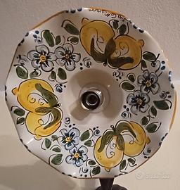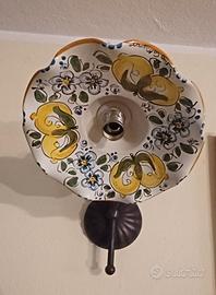 Applique a 1 luce con ceramica decorata di Caltagirone - braccio in ferro battuto colore marrone antico con verniciatura a forno e piatto in ceramica di cm 20 - attacco lampada E14. Disponibili 2 applique identiche - spedizione non inclusa (da verificare se necessario utilizzare una confezione più grande per 2 pezzi per meglio proteggere le ceramiche)