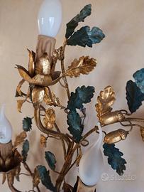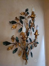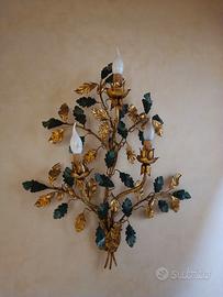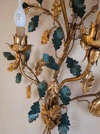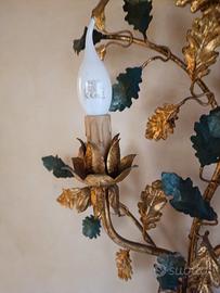Applique in ferro, anni '50/'60, avente struttura elaborata con rami dorati e foglie finemente modellate dorate e in tonalità verde. Configurazione a tre punti luce, rappresentati come boccioli di fiori. Classificabile come stile fiorentino o rustico classico, adatto ad arricchire l'arredamento d'interni.