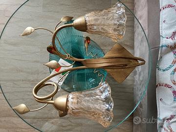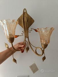 Vendo elegante lampada da parete (applique) in metallo color oro con due diffusori in vetro lavorato a forma di fiore. Design raffinato con dettagli floreali e inserti decorativi color ambra. Il prodotto è **nuovo con cartellino**, mai montato. Perfetta per arredare ambienti in stile classico o shabby chic, ideale per soggiorno, camera da letto, corridoio o ingresso.