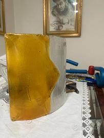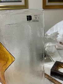 Vendo applique da parete originale in vetro di Murano, realizzata artigianalmente. La lampada presenta un elegante vetro bicolore, con una parte trasparente e una parte color ambra, dalla forma geometrica raffinata In ottime condizioni