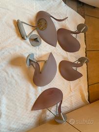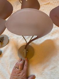 Lavorata a mano, rosa satinato con supporto in metallo grigio argento, montano lampadine alogene, ma sostituibili con moderne lampadine a led. Sono in perfette condizioni funzionanti. Il set è di sei ma vendo anche separatamente. Misure H20, L 33, P 23. Prezzo € 100 al pezzo, 6X€ 550.