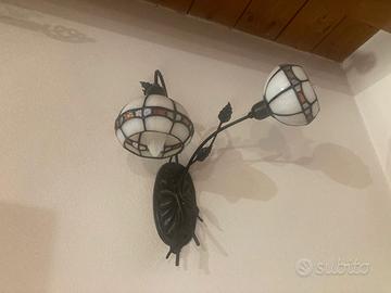 Paralumi Stile Tiffany con due diffusori in vetro opalescente con inserti colorati (ambra e terra di siena), piombati a mano che creano un'illuminazione calda e soffusa. Doppia luce orientata in direzioni opposte per un'ampia diffusione della luminosità.