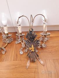 Coppia di appliques dorate in metallo a due bracci antiche con gocce pendenti in cristallo. Cablaggio funzionante, filo sostituito con cordoncino dorato. Lampade con attacco E 14. Occhiello nella parte posteriore per appenderle. Altezza massima (gocce di cristallo comprese) cm. 33, larghezza cm 27, profondità cm. 21. Manca il pendente centrale basso in un’applique. Le foto fanno parte integrante della descrizione . Nelle ultime due foto abbinate a specchio non compreso in questo annuncio (vedere Specchio antico in cornice di legno dorata)