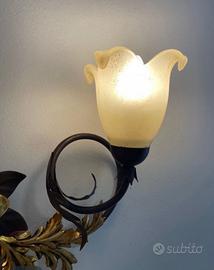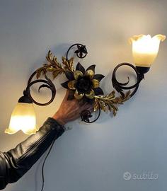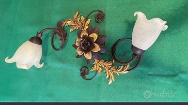Elegante applique in ferro battuto con dettagli floreali. Struttura in ferro battuto finemente lavorata. Decorazioni a forma di fiore e foglie dorate. Due punti luce con paralumi in vetro. Misure 70x35