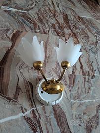 Vendo elegante applique vintage da parete in ottone lucido con due portalampada e diffusori in vetro satinato a forma di fiore.