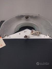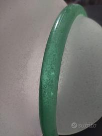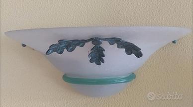 Applique in vetro scavo bianco opaco, decoro in vetro color smeraldo, particolari e foglia decorativa in ferro battuto anticato, un portalampada attacco E27 Dimensioni Altezza 16 cm Lunghezza 41 cm Profondità 22 cm NUOVA, senza imballo originale