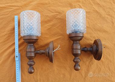 Coppia di applique, lampade da muro in legno tornito color noce. altezza circa 27cm diametro cilindro in vetro 9cm diametro corona per fissaggio a muro 10cm
