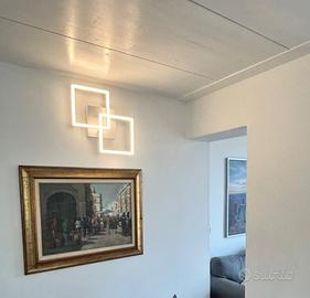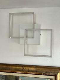 Design: contemporaneo/geometrico con due quadrati luminosi sovrapposti e sfalsati. •Struttura: base rettangolare fissata a parete da cui partono i due telai •Materiale: metallo verniciato bianco opaco •Sorgente luminosa: LED integrato lungo il profilo dei quadrati •Tipo di luce: diffusa e indiretta, effetto “cornice luminosa” •Colore luce: bianco caldo
