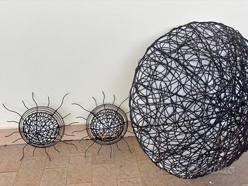 I due articoli piccoli sono realizzati in ferro, mentre quello grande è fatto con una specie di fibra naturale tipo una canna. L'applique grande misura 1 m di diamentro mentre gli altri 30 cm di diametro.