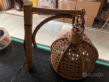 La lampada mostrata nell'immagine è un'applique vintage realizzata con materiali naturali come il bambù e la paglia di Vienna. Si tratta di un complemento d'arredo tipico del design italiano degli anni '60 e '70, spesso associato allo stile "Costa Azzurra" per il suo richiamo a materiali e atmosfere
