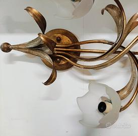Vendo coppia di applique da parete a 3 luci ciascuna, in ferro battuto con finitura dorata antichizzata e diffusori in vetro satinato a forma di fiore.