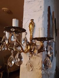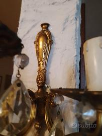 applique vintage ottone dorato a tre lampadine in buone condizioni, le gocce di vetro sfaccettato sono integre, funzionante, misure altezza cm 25, larghezza cm 30, profondità cm 21
