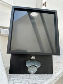 Simpatica idea regalo questo stappa bottiglie da muro per tappi a corona ideale per bottiglie di birra. Poi i tappi si conservano simpaticamente nel contenitore trasparente