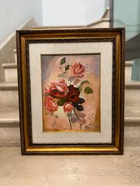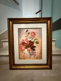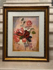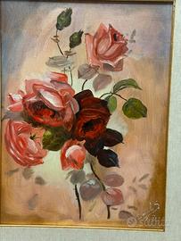 Il dipinto mostra una composizione di rose di diverse tonalità di rosso, con alcune foglie e boccioli. La tecnica pittorica è quella dell'olio su tela, con un uso di sfumature e chiaroscuri che conferiscono profondità all'immagine.