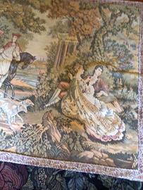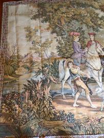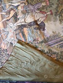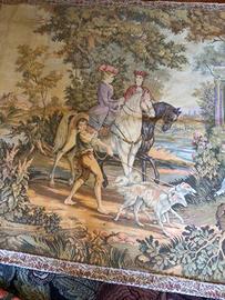 Arazzo foderato in raso/ seta ( vedere foto) scena di caccia con dame e calieri. Acquistato in un antiquario di Bruxelles attorno agli anni 60. Quarto di punto , tessuto resistente, da appendere senza vetro con una semplice stecca di legno dietro ed un cordono ritorto. Misure 2m x 145. Nuovo lavato e disinfettato in tintoria specializzata. Colori non sbiaditi . Molto elegante e raffinato . Solo per intenditori. Bello anche da accostare ad un arredamento moderno , fa una notevole figura.. e così non se ne trovano più! Possibilità di trasporto a Roma o da calcolare