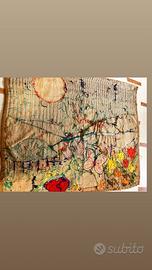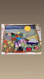 L'opera nell'immagine è un pezzo di arte tessile. Non ha un nome proprio visibile, ma è realizzata utilizzando tecniche miste come l'appliqué e il ricamo per creare un paesaggio colorato e strutturato. Tecnica: Combina tessuti ritagliati e cuciti su uno sfondo (applique) con dettagli aggiunti tramite fili (ricamo). • Stile: Lo stile è figurativo e artigianale, con un'estetica che ricorda l'arte popolare o un quilt decorativo. • Soggetto: Rappresenta una scena naturalistica che include una coccinella, una farfalla, fiori, un sole e un paesaggio.