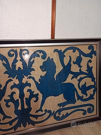 Arazzo raffigurante due belve alate affrontate. Blu su fondo beige. Perfette condizioni.