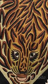 Arazzo, riproduzione in seta e lana, del Kashmir, di una tigre tessuto con la tecnica, più raffinata, con cui si realizzano i tappeti Ghilim. Tutta la lavorazione è stata eseguita a mano su un panno di feltro o lana cotta e i colori sono tutti estratti da vegetali o minerali. La parte finale della coda non è visibile perché per poterla fotografare stesa è rimasta dietro il supporto