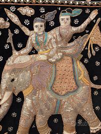 Vendo bellissimo arazzo decorativo in stile orientale, raffigurante due elefanti con cavalieri riccamente decorati.