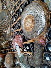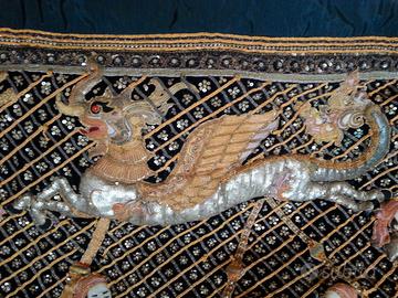 Vendo grande arazzo kalaga (Thailandia del nord), acquistato in viaggio negli anni '80 , interamente fatto a mano su fondale nero, riccamente ornato con figure in rilievo impreziosite da paillettes, perline, corallini e fili dorati . Nella parte superiore presenti 13 passanti in raso per appenderlo a bastone . Conservato con estrema cura.