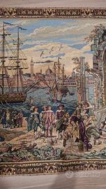Questo arazzo rappresenta una veduta del XVII secolo dell'antico porto di Venezia, in Italia. In una scena di banchina affollata, i commercianti locali offrono le loro merci ai mercanti in visita, riccamente vestiti, provenienti da un paese lontano, il cui galeone è ormeggiato nel porto. La Repubblica di Venezia fu una grande potenza marittima durante il Medioevo e il Rinascimento, e un'area di sosta per le Crociate e la Battaglia di Lepanto, oltre che un importantissimo centro commerciale (in particolare per seta, grano e spezie) e artistico dal XIII secolo fino alla fine del XVII. Questo rese Venezia una città ricca per gran parte della sua storia.