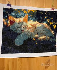 Simpatico gatto che dorme sotto le fronde illuminato da una calda luce. Tela in cotone 50x40 centimetri ricamata finemente a mano a punto croce.