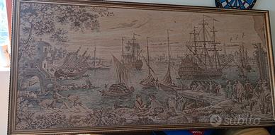 Grande arazzo decorativo in stile classico, raffigurante una vivace scena portuale veneziana del XVIII secolo. L’opera mostra navi a vela ormeggiate, figure in abiti d’epoca, e un paesaggio urbano sullo sfondo, ricco di dettagli architettonici e naturalistici. I colori tenui e il tratto raffinato rendono questo arazzo un pezzo di grande fascino storico ed estetico.