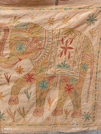 Arazzo in tessuto di cotone 100%, made in India, ricamato, raffigurante due elefanti e elementi decorativi, come nuovo. Misura 94 per 150 cm