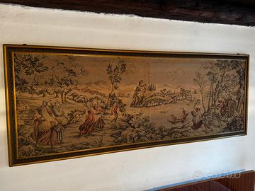 Raffinato arazzo da parete di grandi dimensioni, raffigurante una ricca scena pastorale d’epoca. La composizione presenta diverse figure umane impegnate in attività rurali (raccolto, trasporto su carro, pesca in barca) immerse in un paesaggio bucolico con fiumi, castelli e montagne sullo sfondo.Stile: Riproduzione meccanica di alta qualità in stile Gobelin/Aubusson, tipica della metà del XX secolo (anni '50/'60).Materiali: Tessuto tramato con colori pastello (beige, marrone, rosa antico, verde salvia).Cornice: L'arazzo è già montato su una solida struttura con cornice dorata lavorata, pronta per essere appesa.Stato di conservazione: Eccellente stato generale, colori ben conservati e assenza di strappi o macchie evidenti (come visibile in foto)