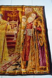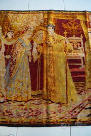 Vendo splendido arazzo vintage di grandi dimensioni (128x195 cm) raffigurante una scena regale ispirata alla corte imperiale russa. La figura centrale ricorda uno zar circondato da dignitari in abiti sontuosi, in un contesto ricco di dettagli storici e decorativi.
