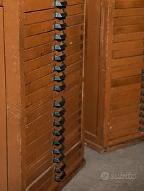 splendida cassettiera archivio schedario da tipografia vintage design Modernariato originali anni ’50, provenienti da laboratorio artigiano.