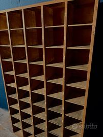 Archivio schedario vintage autentico pezzo di storia industriale, questo schedario in legno risale agli anni ’50. Modernariato, Composto da 50 scomparti inclinati, conserva il fascino autentico dell’arredo funzionale del dopoguerra, con una struttura solida e patina del tempo che ne valorizza l’anima vissuta.