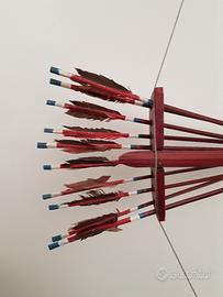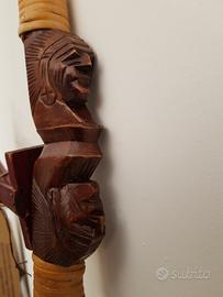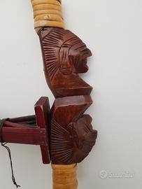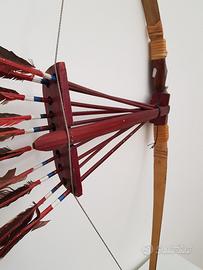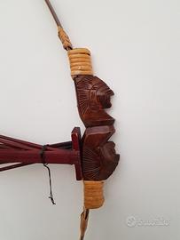 Arco decorativo in stile etnico, completo di un set di frecce. - Arco in legno con decorazioni intagliate. - Frecce con impennaggio rosso e blu. - Supporto per frecce in legno scuro.