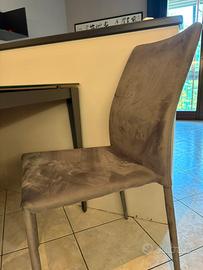 Completano la zona giorno un tavolo da pranzo in cristallo antigraffio finitura Velvet, opaco grigio. Lunghezza 140 allungabile 180 -220 cm. Con quattro sedie grigie tessuto effetto alcantara antimacchia.