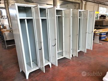 armadi biposto per spogliatoi usati, si tratta di 3 armadietti per spogliatoi e sporco/pulito a due ante con predisposizione di serratura. dimensioni: 80X50cm h180cm, interno 20/40X46cm ATTENZIONE!!! vendita solo in blocco a 350,00€