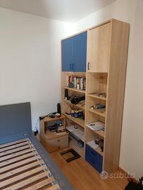 Vendo due mobili coordinati in laminato effetto legno chiaro con dettagli blu, perfetti per cameretta o studio.